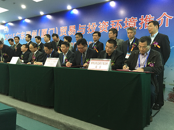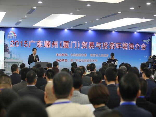 2015年4月12日,廣東潮州(廈門)貿(mào)易與投資環(huán)境推介會(huì)在廈門國際會(huì)議展覽中心成功舉辦,會(huì)上共有29個(gè)項(xiàng)目簽約,總投資額達(dá)132.4億元,涵蓋交通、港口、衛(wèi)浴、旅游、食品等產(chǎn)業(yè)。廈門市副市長國桂榮,漳州市副市長黃慶輝,潮州市委書記李水華,市委副書記、市長盧淳杰,潮州市各縣區(qū)、各有關(guān)部門領(lǐng)導(dǎo),有關(guān)商協(xié)會(huì)負(fù)責(zé)人、企業(yè)家代表、嘉賓共計(jì)250人出席了推介會(huì)。標(biāo)志著我市積極實(shí)施“走出去,引進(jìn)來”戰(zhàn)略,主動(dòng)融入海西經(jīng)濟(jì)區(qū),推動(dòng)潮閩臺經(jīng)貿(mào)協(xié)同發(fā)展,促進(jìn)區(qū)域經(jīng)濟(jì)交流合作,著力打造21世紀(jì)海上絲綢之路新起點(diǎn)又取得新的成果。